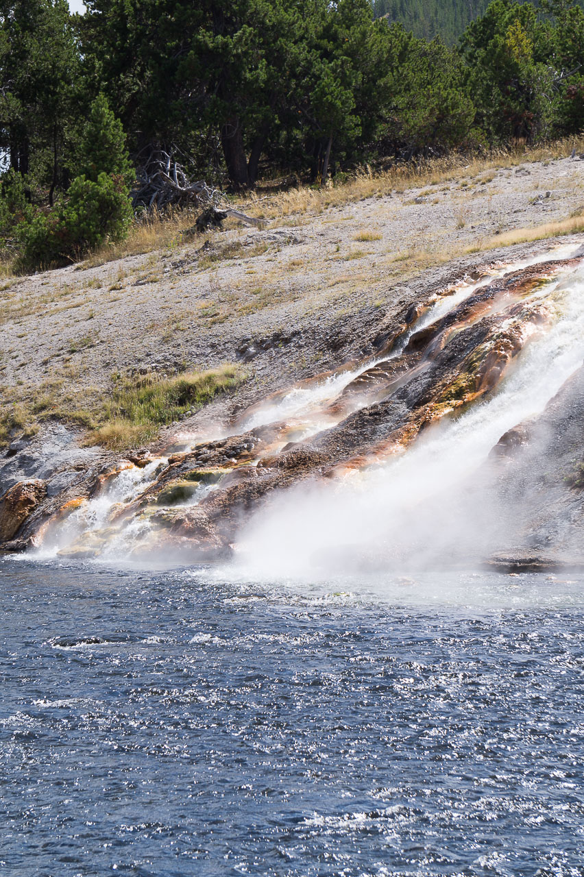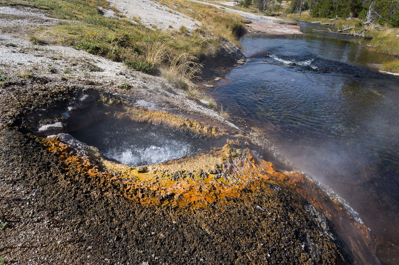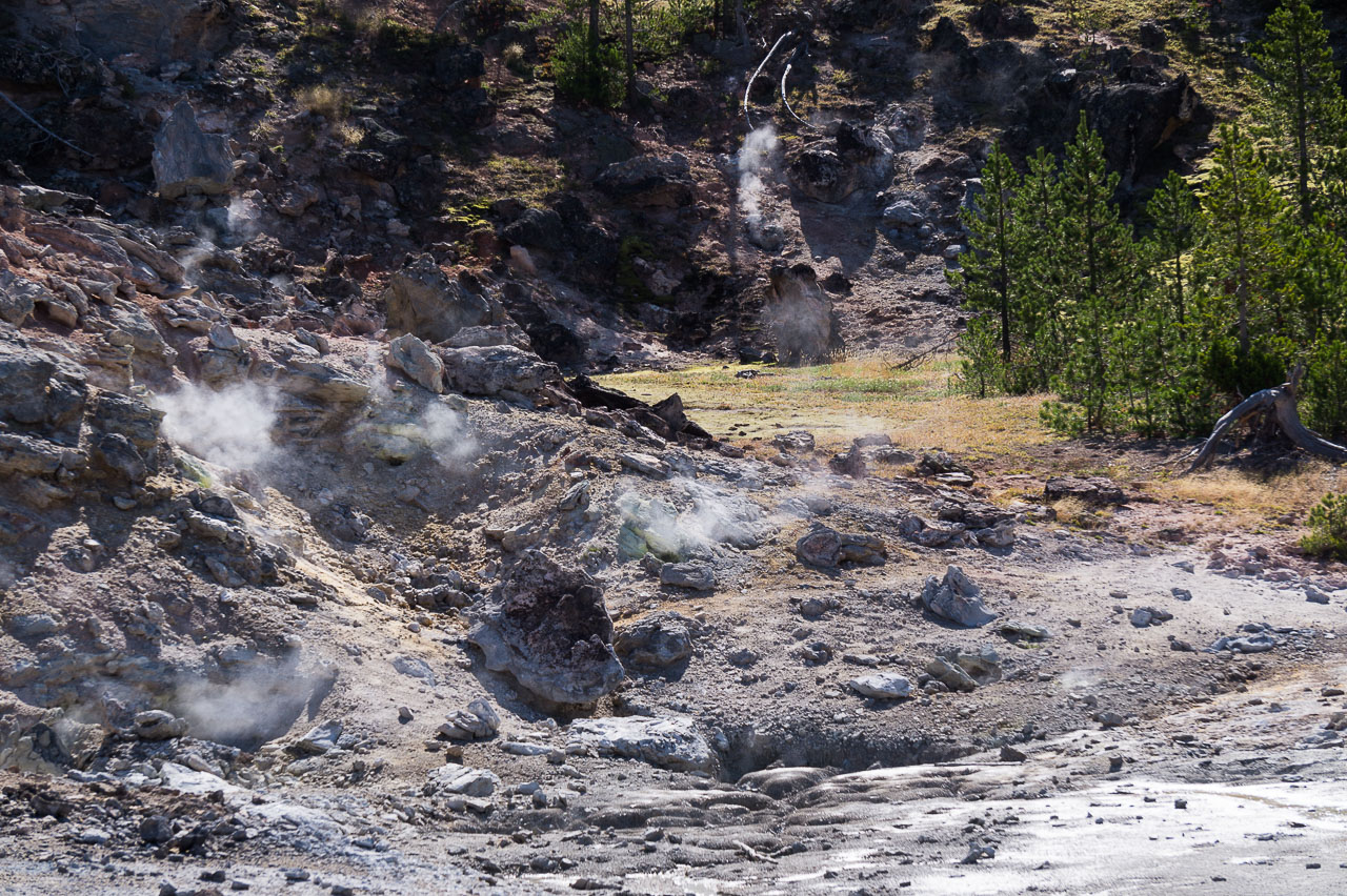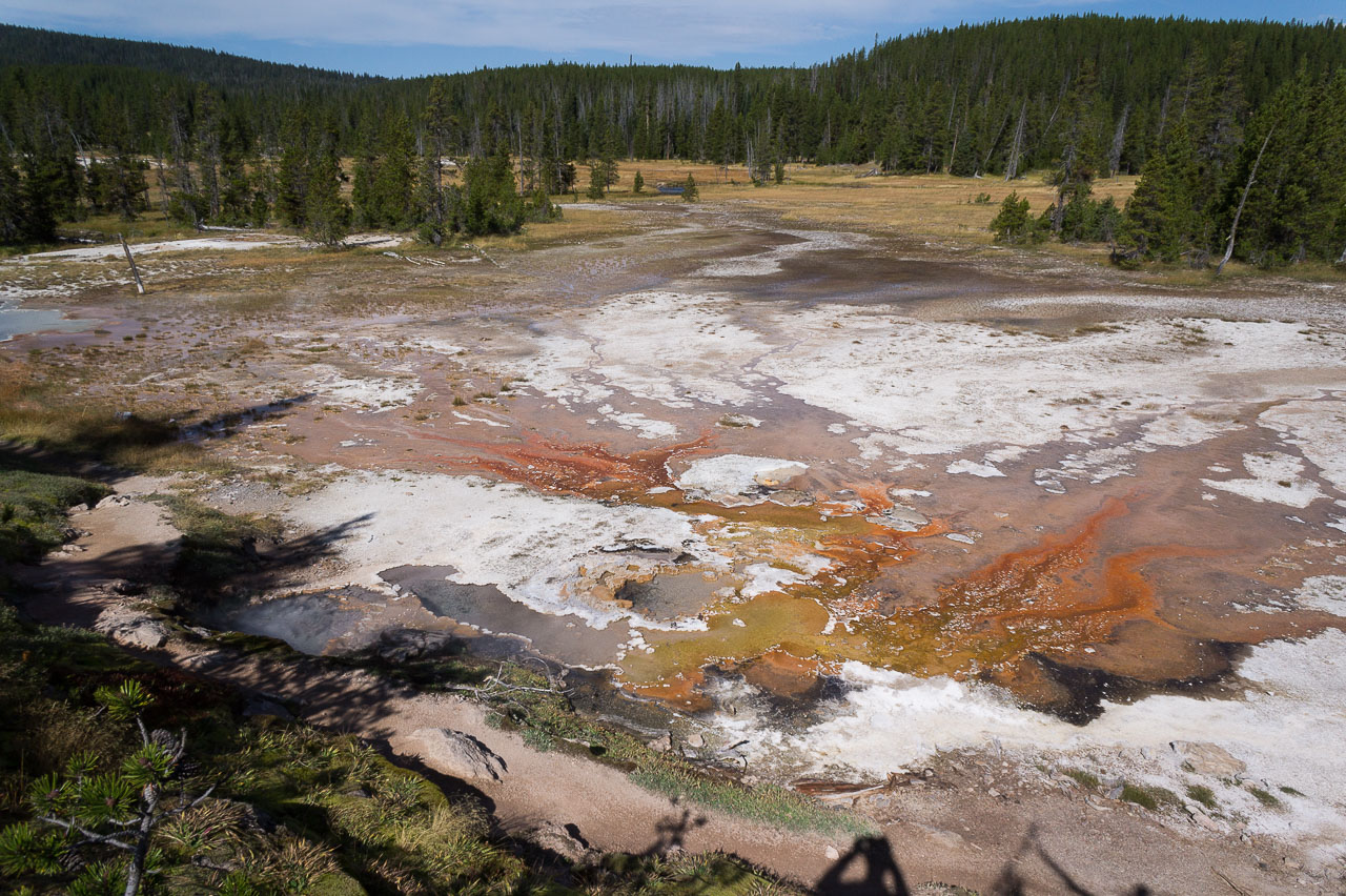 Puis nous arrivons dans la pleine des geysers, qui était vraiment impressionnante. On y rencontre un marcheur fou, très sympathique, qui aurait plu à Gilbert. Il voudrait faire St Jacques, après avoir traversé 3 fois les USA du Nord au Sud. Après s’être égarés sur une petite plage au bord du lac, qui avait un très joli petit geyser vert, on trouve enfin le chemin du camp, et là, glandouille et repos bien mérité. Ce camp nous donne l’impression d’être des Robinsons sur une île déserte.Comme le ciel était dégagé, on attend la nuit complète pour voir les étoiles. Un spectacle superbe, comme on était sur la plage, on les voyait se refléter dans le lac. Le ciel était tellement lumineux que nous pouvions contempler la voie lactée. Par contre on entendais de nombreux bruits d’animaux sauvages très difficilement identifiables: un genre de flûte mal accordé par exemple… Pas très rassurés par ce remue ménage, les Rangers nous avaient signalés un grizzli dans le secteur, on rentre se coucher. Orage et nuit pluvieuse.