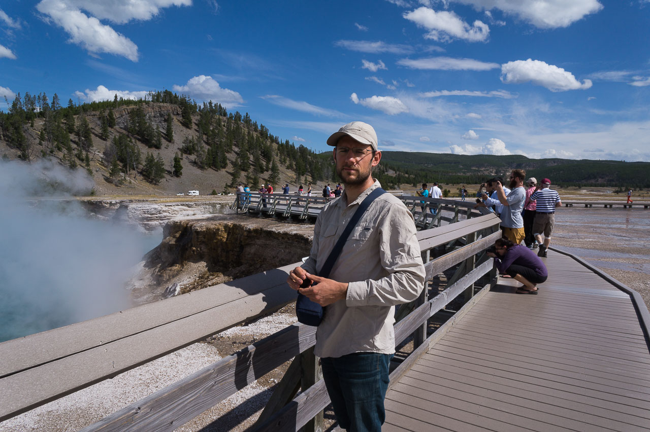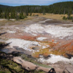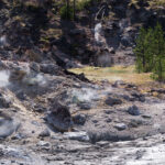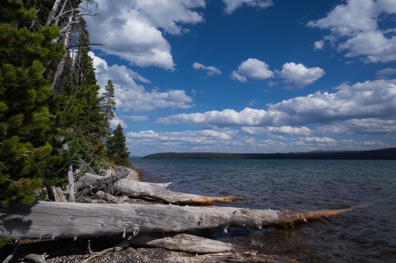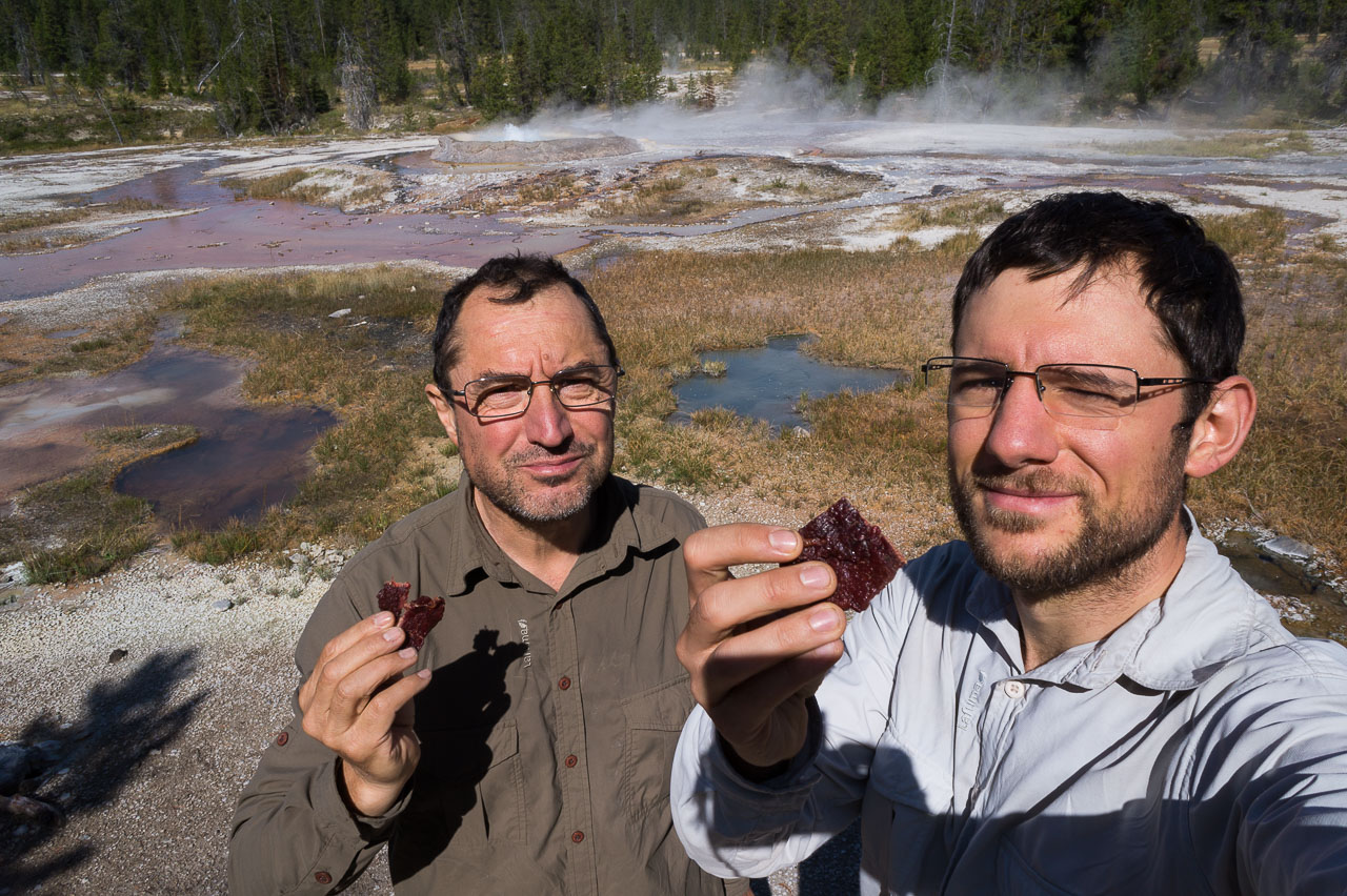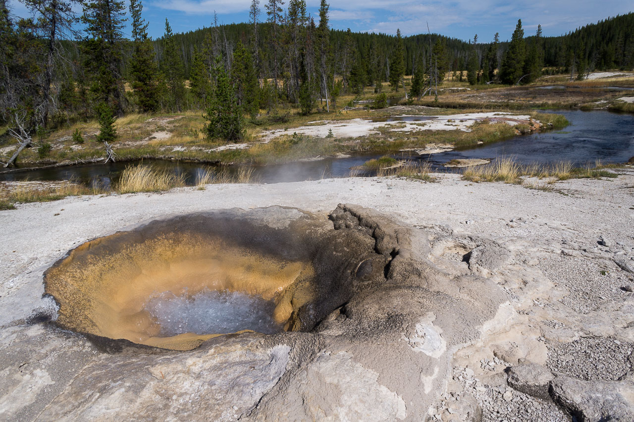 Puis nous arrivons dans la pleine des geysers, qui était vraiment impressionnante. On y rencontre un marcheur fou, très sympathique, qui aurait plu à Gilbert. Il voudrait faire St Jacques, après avoir traversé 3 fois les USA du Nord au Sud. Après s’être égarés sur une petite plage au bord du lac, qui avait un très joli petit geyser vert, on trouve enfin le chemin du camp, et là, glandouille et repos bien mérité. Ce camp nous donne l’impression d’être des Robinsons sur une île déserte.Comme le ciel était dégagé, on attend la nuit complète pour voir les étoiles. Un spectacle superbe, comme on était sur la plage, on les voyait se refléter dans le lac. Le ciel était tellement lumineux que nous pouvions contempler la voie lactée. Par contre on entendais de nombreux bruits d’animaux sauvages très difficilement identifiables: un genre de flûte mal accordé par exemple… Pas très rassurés par ce remue ménage, les Rangers nous avaient signalés un grizzli dans le secteur, on rentre se coucher. Orage et nuit pluvieuse.
