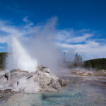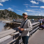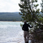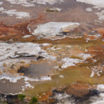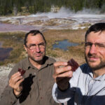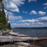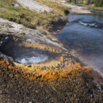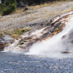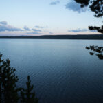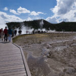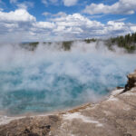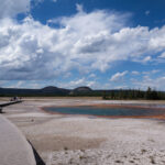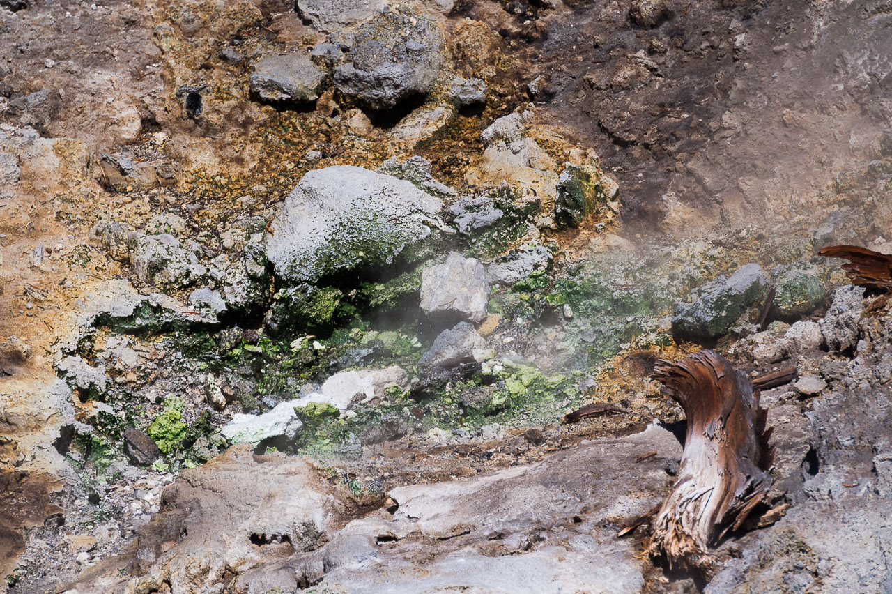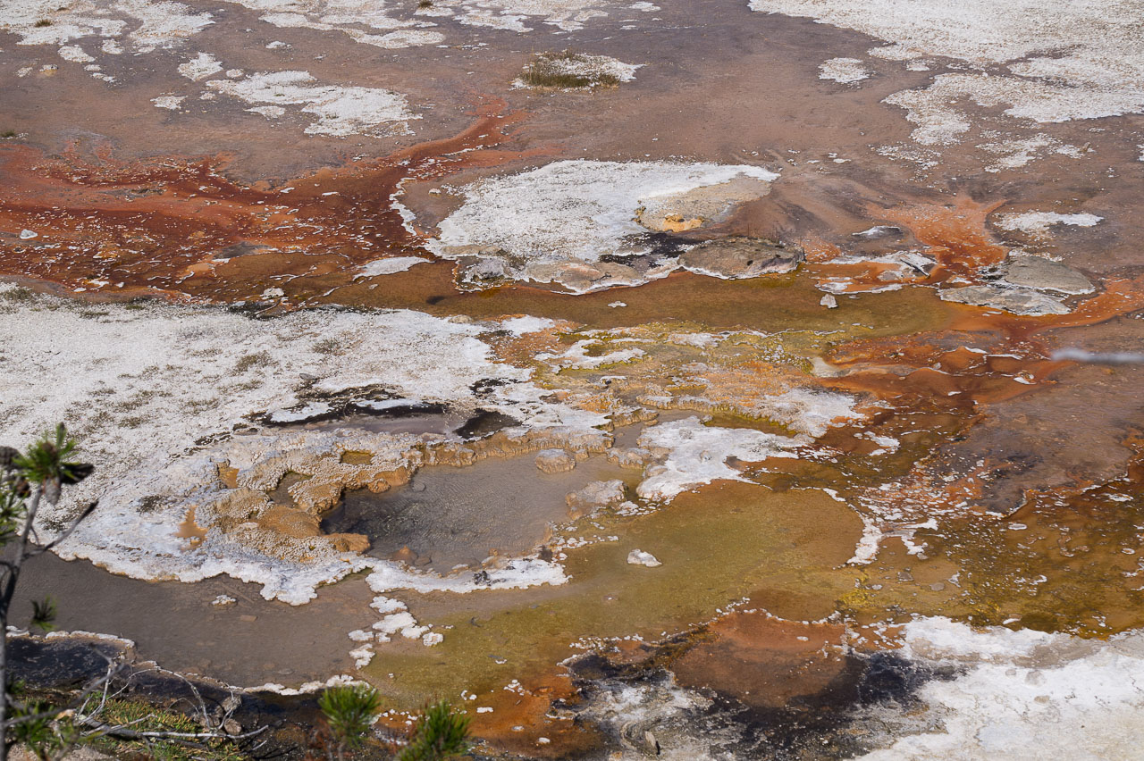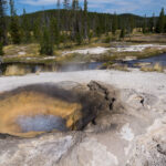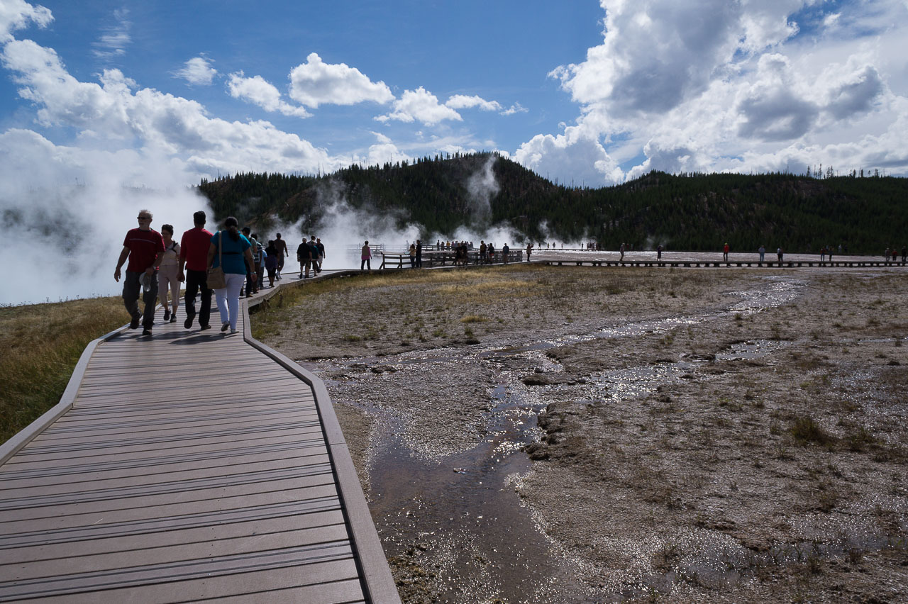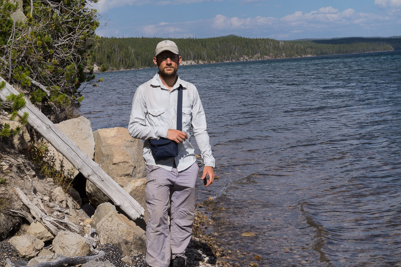 Puis nous arrivons dans la pleine des geysers, qui était vraiment impressionnante. On y rencontre un marcheur fou, très sympathique, qui aurait plu à Gilbert. Il voudrait faire St Jacques, après avoir traversé 3 fois les USA du Nord au Sud. Après s’être égarés sur une petite plage au bord du lac, qui avait un très joli petit geyser vert, on trouve enfin le chemin du camp, et là, glandouille et repos bien mérité. Ce camp nous donne l’impression d’être des Robinsons sur une île déserte.Comme le ciel était dégagé, on attend la nuit complète pour voir les étoiles. Un spectacle superbe, comme on était sur la plage, on les voyait se refléter dans le lac. Le ciel était tellement lumineux que nous pouvions contempler la voie lactée. Par contre on entendais de nombreux bruits d’animaux sauvages très difficilement identifiables: un genre de flûte mal accordé par exemple… Pas très rassurés par ce remue ménage, les Rangers nous avaient signalés un grizzli dans le secteur, on rentre se coucher. Orage et nuit pluvieuse.